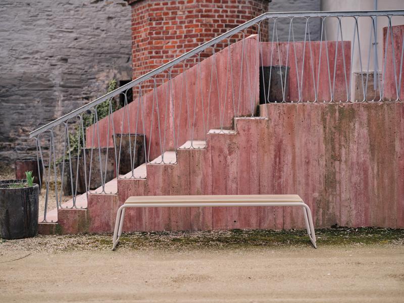Sedalna površina iz lesenih letev. Hrbtni naslon in konstrukcija iz okroglih jeklenih profilov