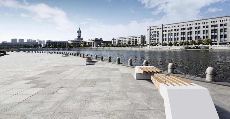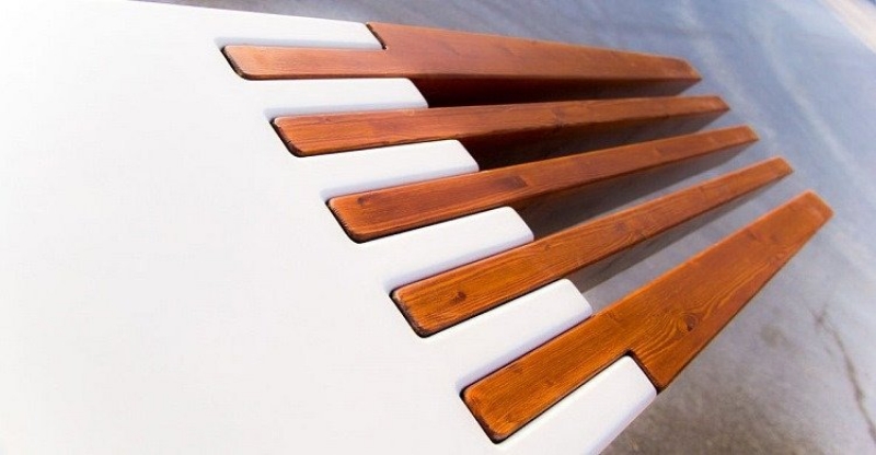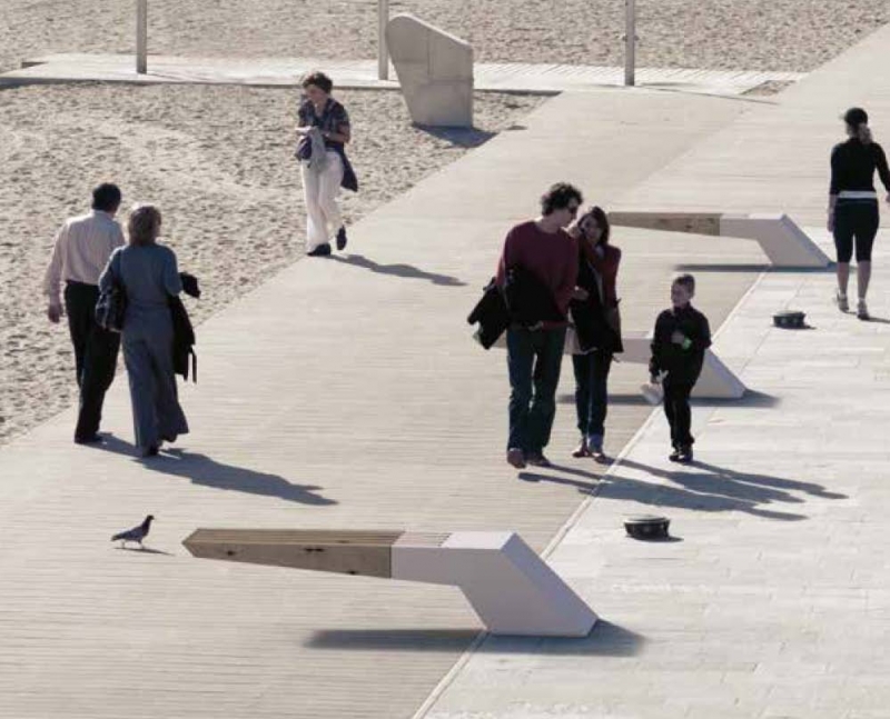 Klop iz betona ali marmorja. Sedalna površina z lesenimi letvami.