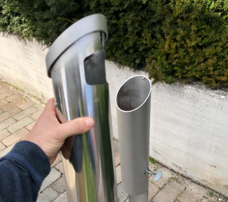 Konstrukcija: Izdelan iz nerjavnega (inox) jekla. Površina / barva: Satiniran, mat površina. Pritrjevanje: Za privijačenje na primeren tlak ali temelj. Z betonsko klado. Vzdrževanje / praznjenje: S štiri-kotno ključavnico.