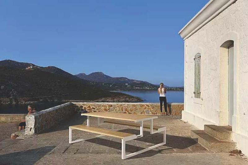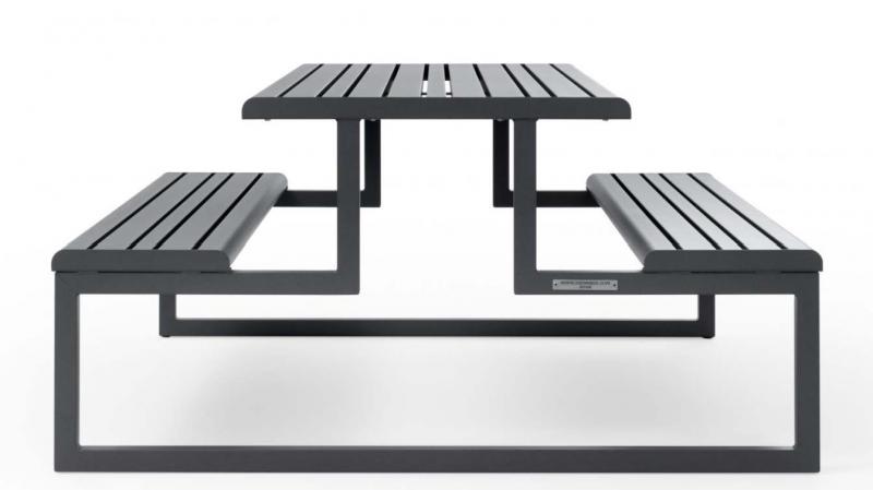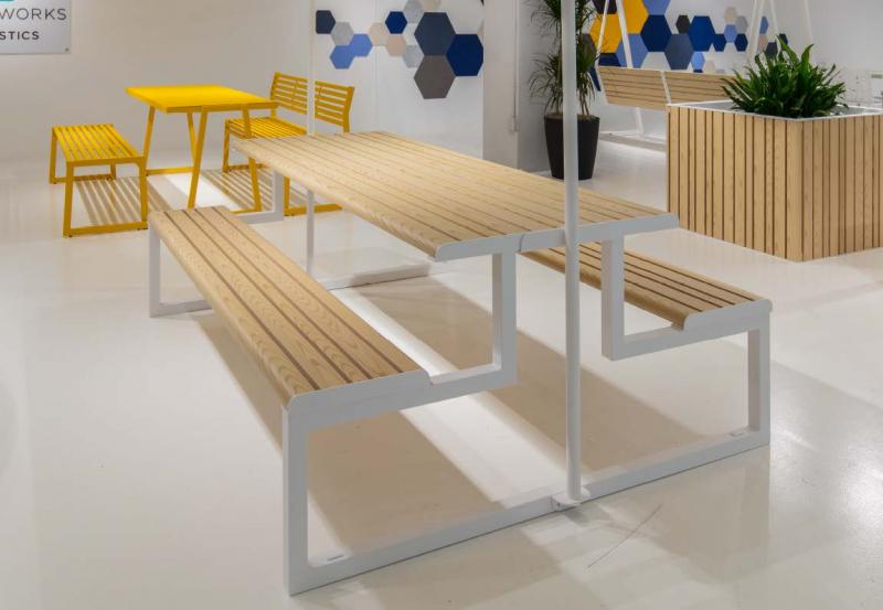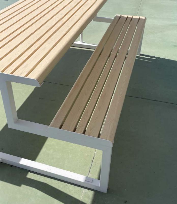 Sedalni del in površina mize iz aluminijastih letev v imitaciji lesa.