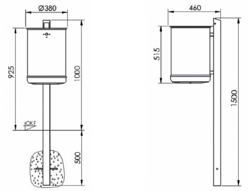 Koš iz polne jeklene pločevine. Izvedba s pepelnikom ali brez.