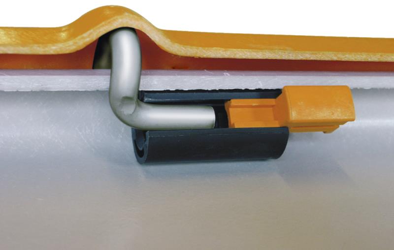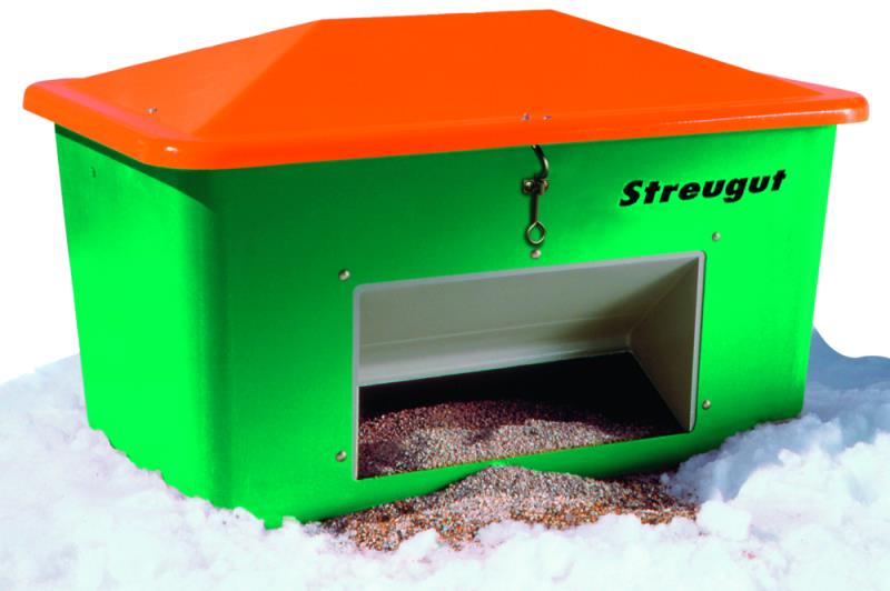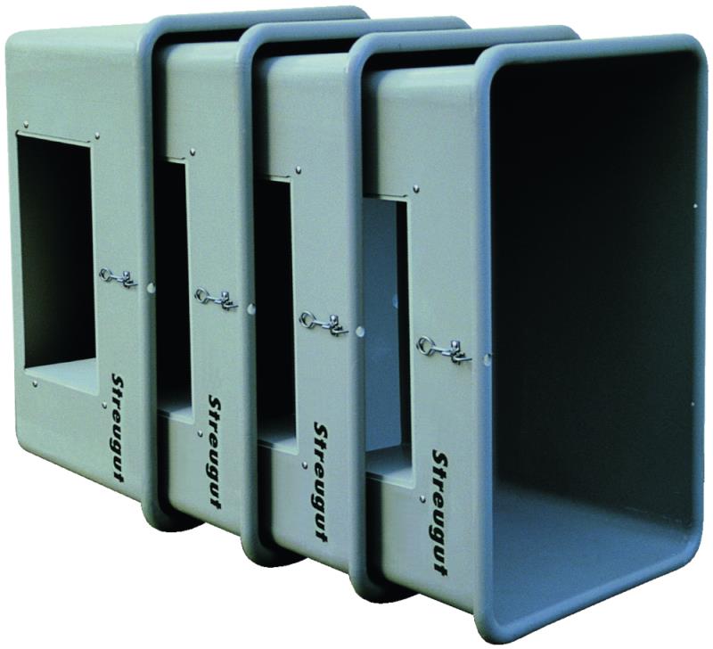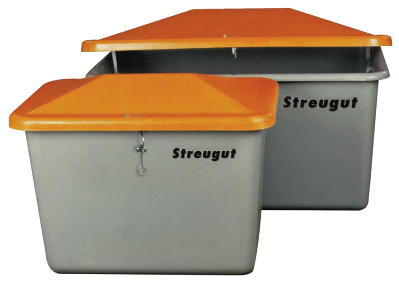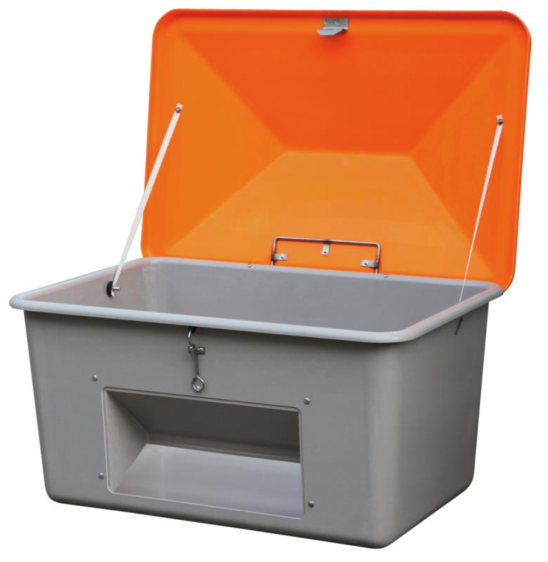 Kontejner in pokrov iz ojacane umetne mase (GFK) s steklenimi vlakni. Z opornim drogom na pokrovu v legiranem jeklu. Pokrov v oranžni barvi.