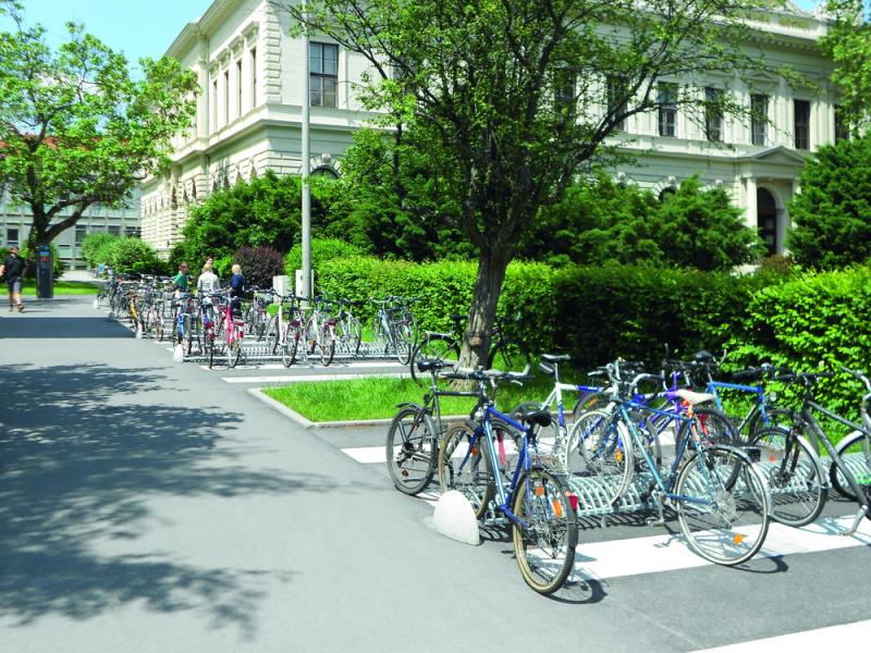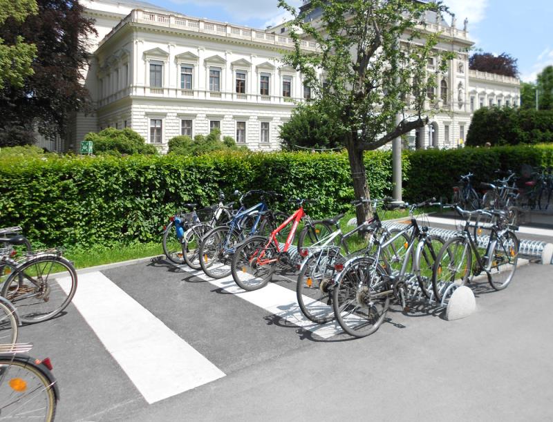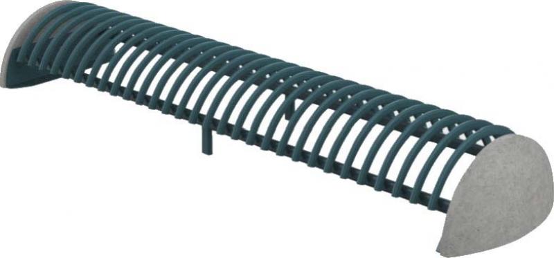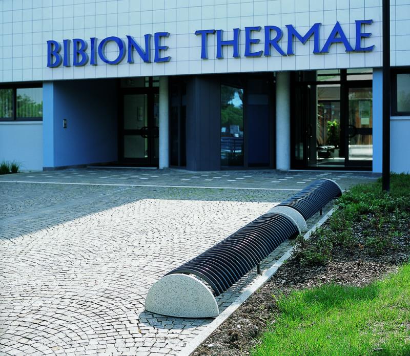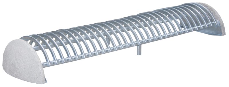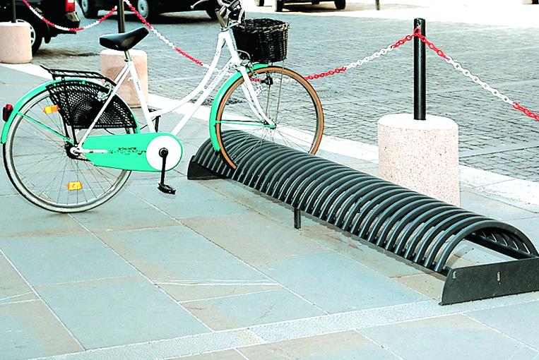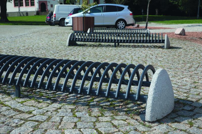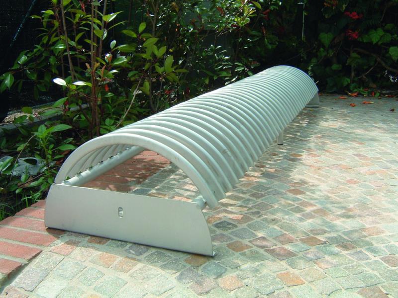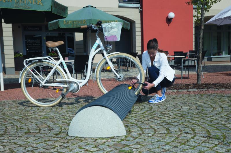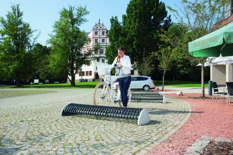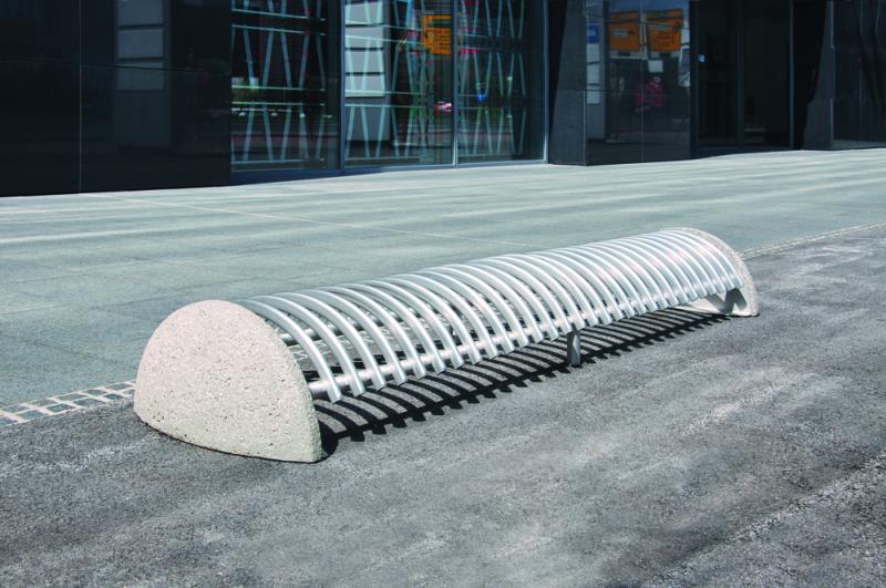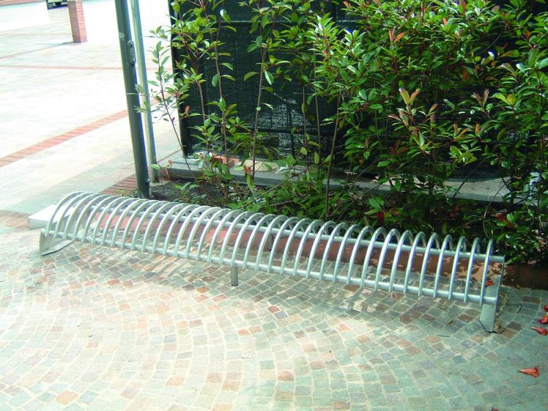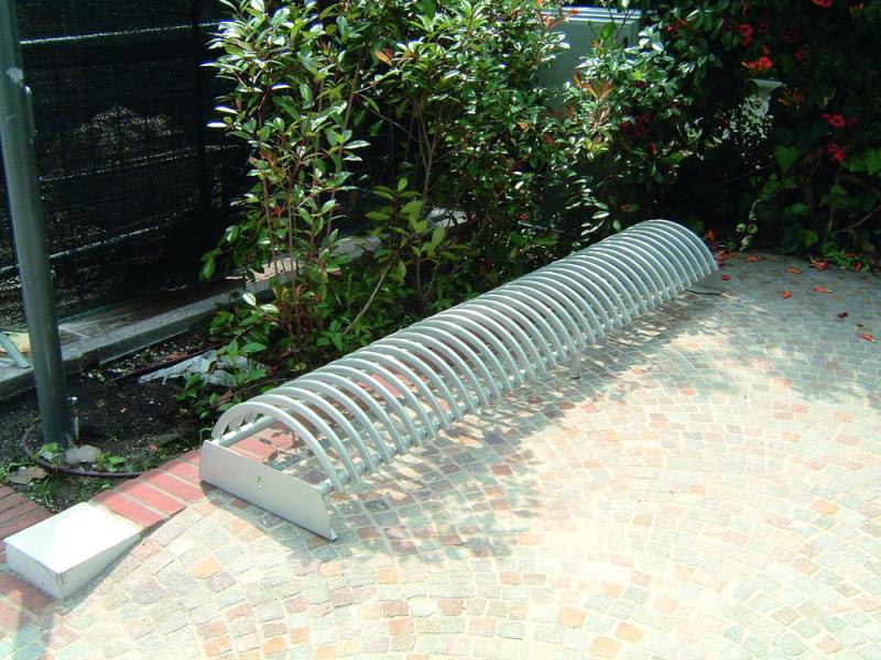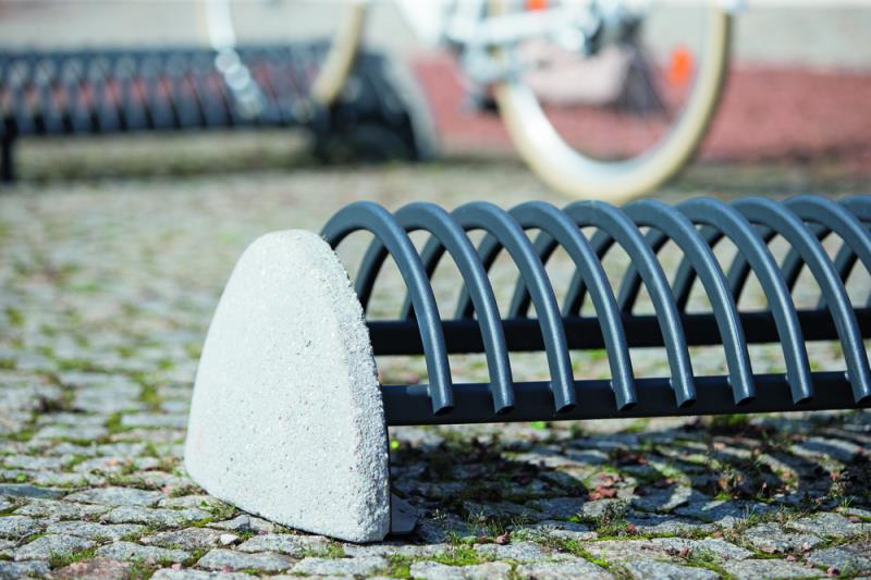 Stojalo za kolesa z betonskim podstavkom, s stranskimi držali za pritrjevanje v tla s sidrnimi vijaki. Držalo je povezano z dvema ovalnima jeklenima profiloma. Parkirna površina je sestavljena iz polkrožnih zakrivljenih profilov. Primerno za eno ali dvostransko parkiranje koles.