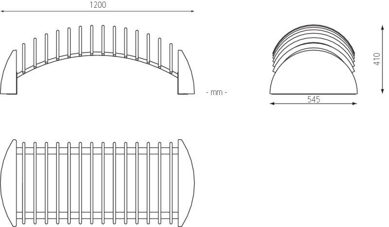 Ukrivljeno stojalo za kolesa z betonskim podstavkom, s stranskimi držali za pritrjevanje v tla s sidrnimi vijaki. Držalo je povezano z dvema ovalnima, ukrivljenima, jeklenima profiloma. Parkirna površina je sestavljena iz polkrožnih zakrivljenih profilov. Primerno za eno ali dvostransko parkiranje koles.