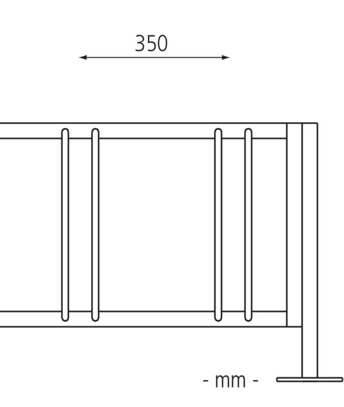 Osnovni okvir iz jekla, kvadratni cevni profil 35 x 35 mm. Držala iz okrogle cevi premer 15 mm. Kot postavite 90 stopinj. Nizka postavitev za kolesa s širino 43 mm, visoka postavitev primerna za gorska kolesa s širino 53 mm. Razmak med kolesi 350 mm. Ob dobavi razstavljeno, sestavljeno iz treh enot. Dobava vkljucuje vijake za pritrditev držal na nosilni okvir.