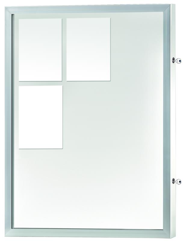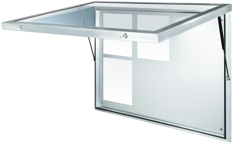 Enostranska vitrina iz aluminija z vogalnim profilom. Vitrina z vzdolžnim krilom ima skrite tecaje. Magnetna hrbtna stena v beli barvi. Zaklepanje z dvema cilindricnima kljucavnicama. Vkljucno z napisno letvijo iz akrilnega stekla, vidna višina 80 mm. Zakrita prezracevalna odprtina, ki preprecuje rosenje stekla.