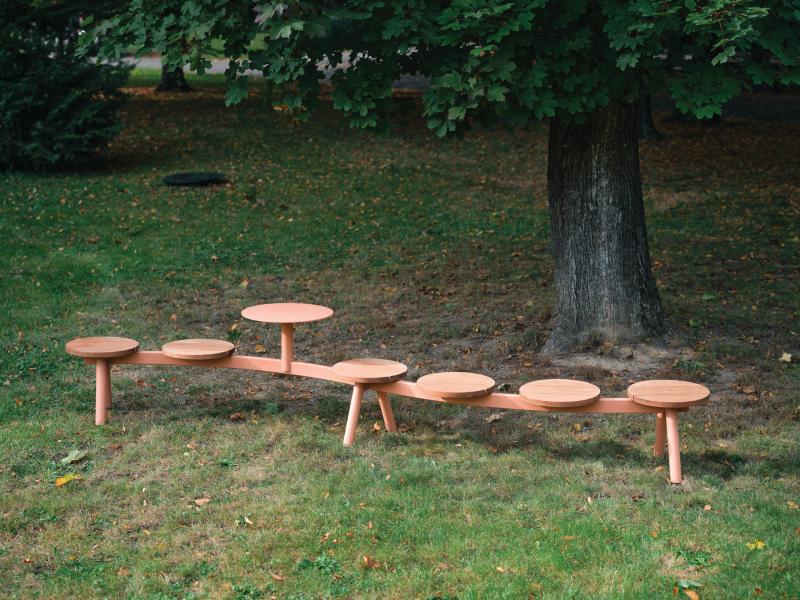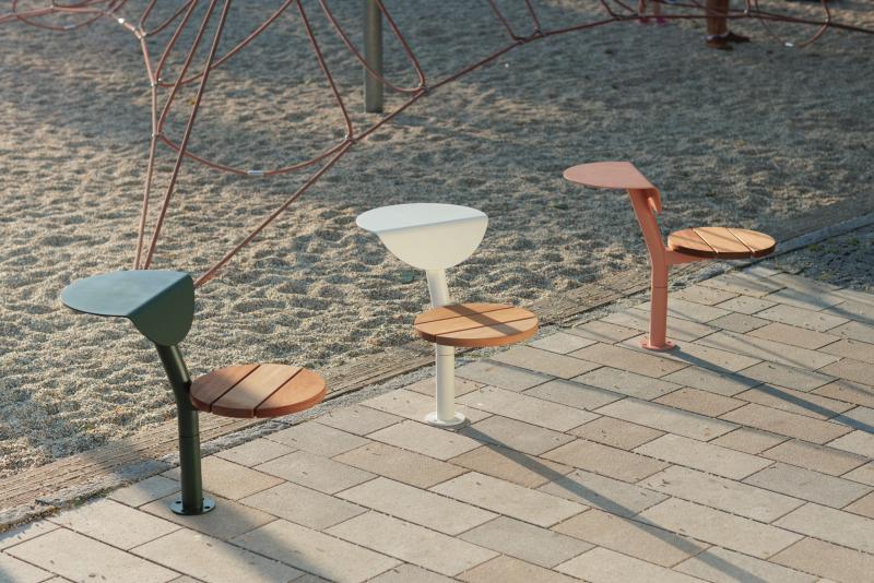 Klop s konstrukcijo iz jekene pločevine. Sedalna površina iz tropskega letev ali HPL.