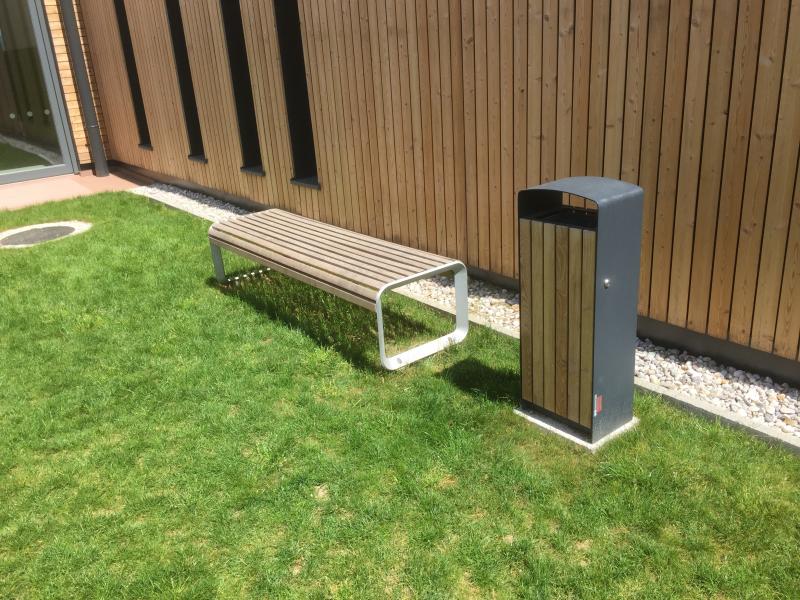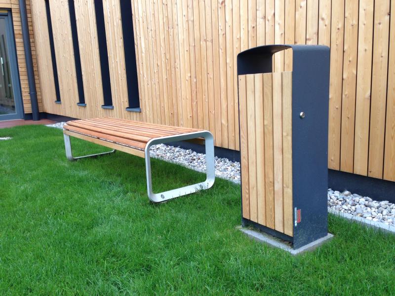 Konstrukcija koša v jekleni pločevini, z lesenimi letvami.