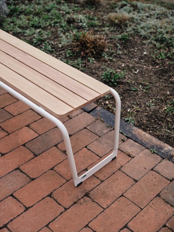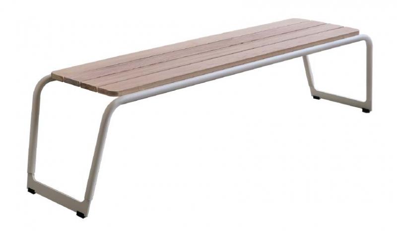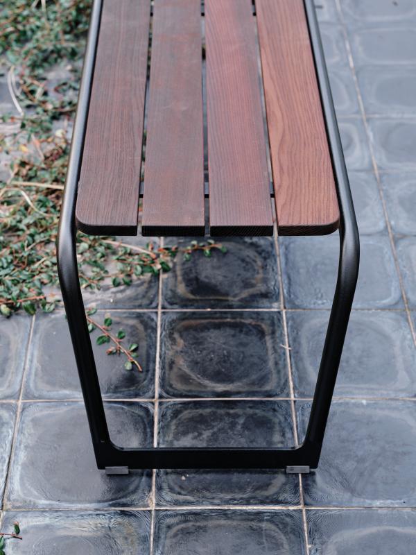 Sedalna površina iz lesenih letev. Hrbtni naslon in konstrukcija iz okroglih jeklenih profilov