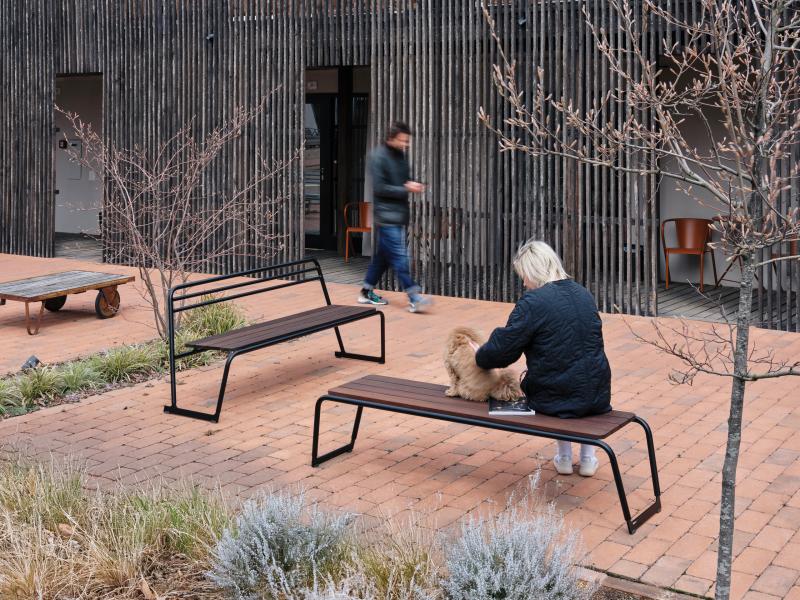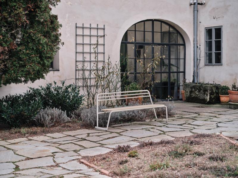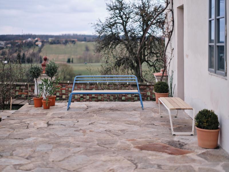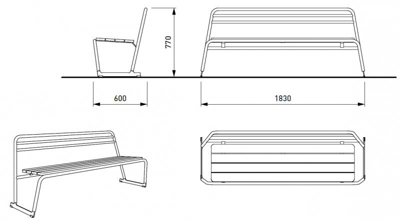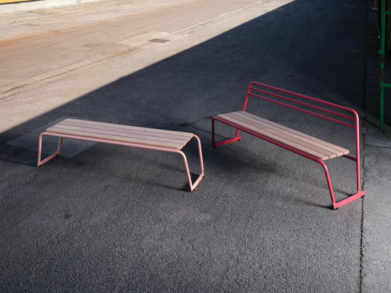 Sedalna površina iz lesenih letev. Hrbtni naslon in konstrukcija iz okroglih jeklenih profilov