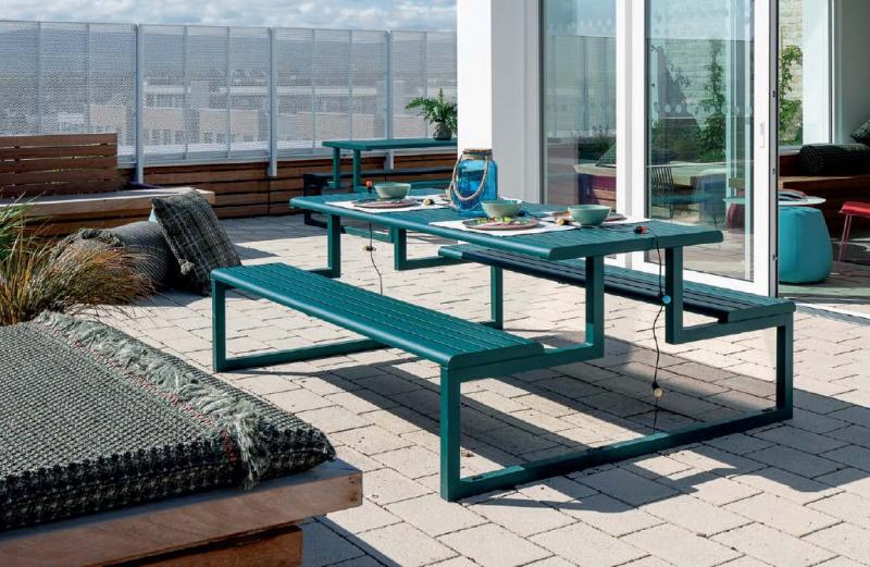 Sedalni del in površina mize iz aluminijastih letev v imitaciji lesa.