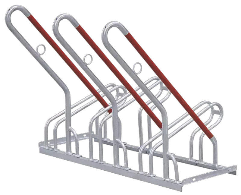 Stabilna vroče cinkana jeklena konstrukcija z privijačenimi držali za kolesa in naslonom za kolesa.
